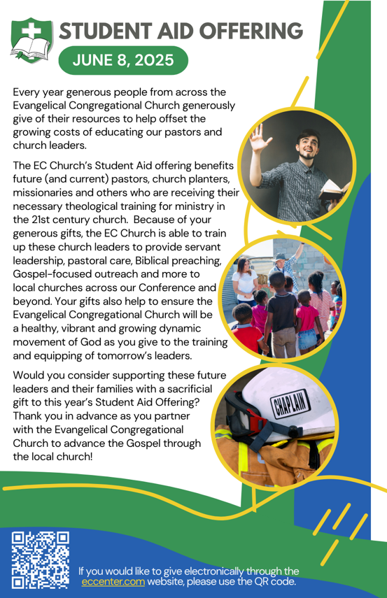 Every year in September the Evangelical Congregational Church provides bulletin inserts to remind our congregations to pray for and support our students through the annual Student Aid offering. If you are interested in supporting our students financially, please click on the link below to donate to the student aid offering at any time of the year